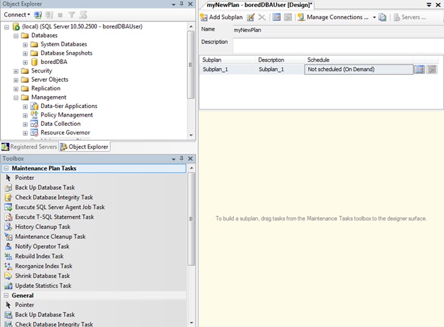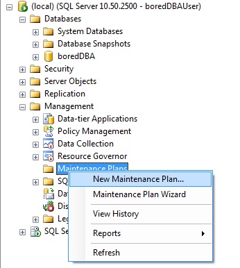 Within SSMS expand Management, right click “Maintenance Plan”, and select “New Maintenance Plan”: