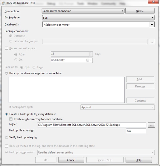 Using the drop down lists and text boxes, select your database(s) and backup location then press OK.