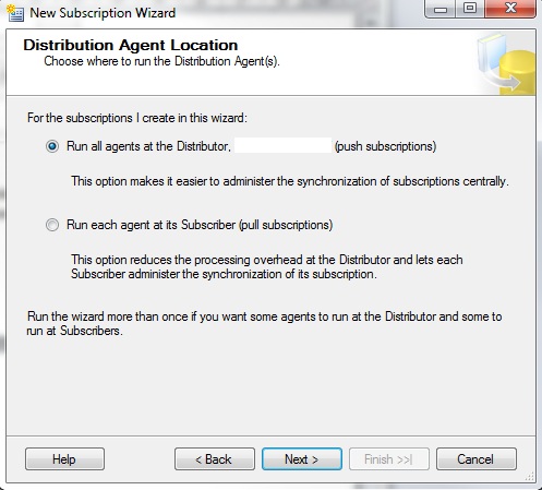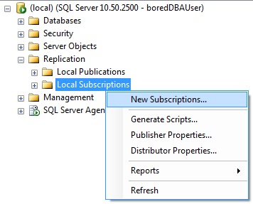 You can start the Subscription wizard from either the Publisher or the Subscriber by clicking as follows: