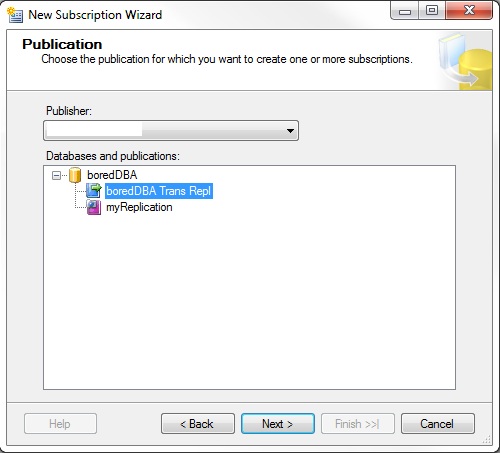 Note that if you are starting this wizard from the publisher than just select the database and publication and you’re done. If you are starting the wizard from a subscriber then you will need to use the drop down to connect to the publisher: