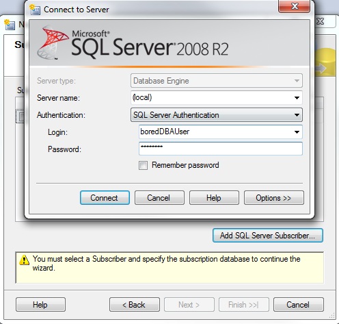 Either way, you now need to add the server you wish to be the Subscriber. Click the Add “SQL Server Subscriber…” button…