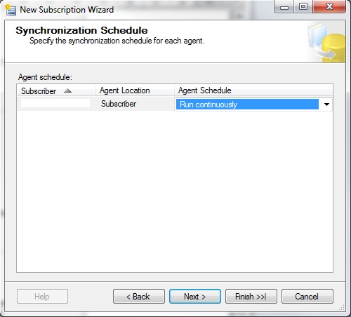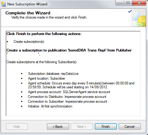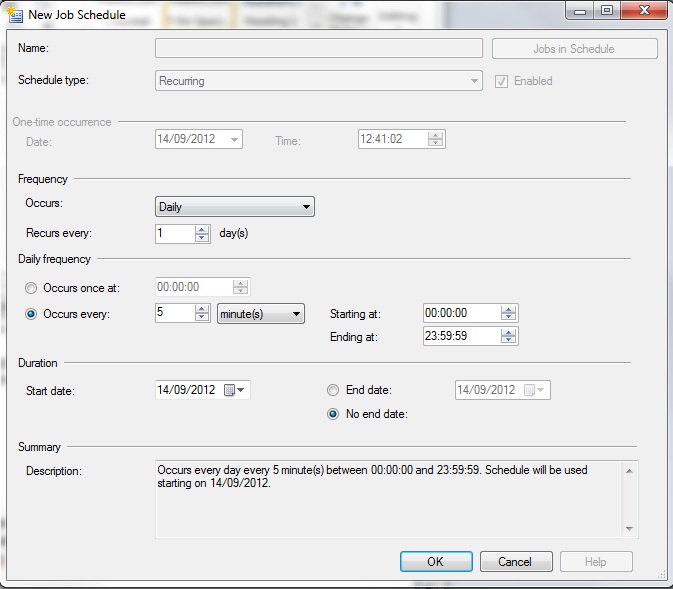 Run on Demand will require you to manually run the agent job each time you wish to align your data. This is good if you are working away from a network and do not replicate to a schedule. For all other times I would recommend defining a schedule. In this case I’ll choose every 5 mins, 24 hours a day…
