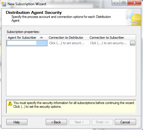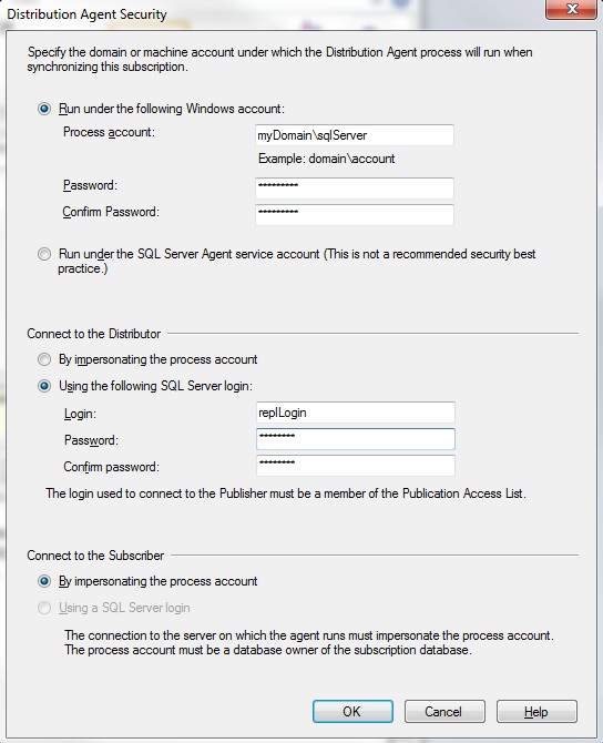 You must now select your security settings through which replication will connect to both the Distributor and the Subscriber. Ideally these would be a combination of domain and SQL accounts (as I have used below), but you can also use the Agent Account but, as stated, this is not best practice.